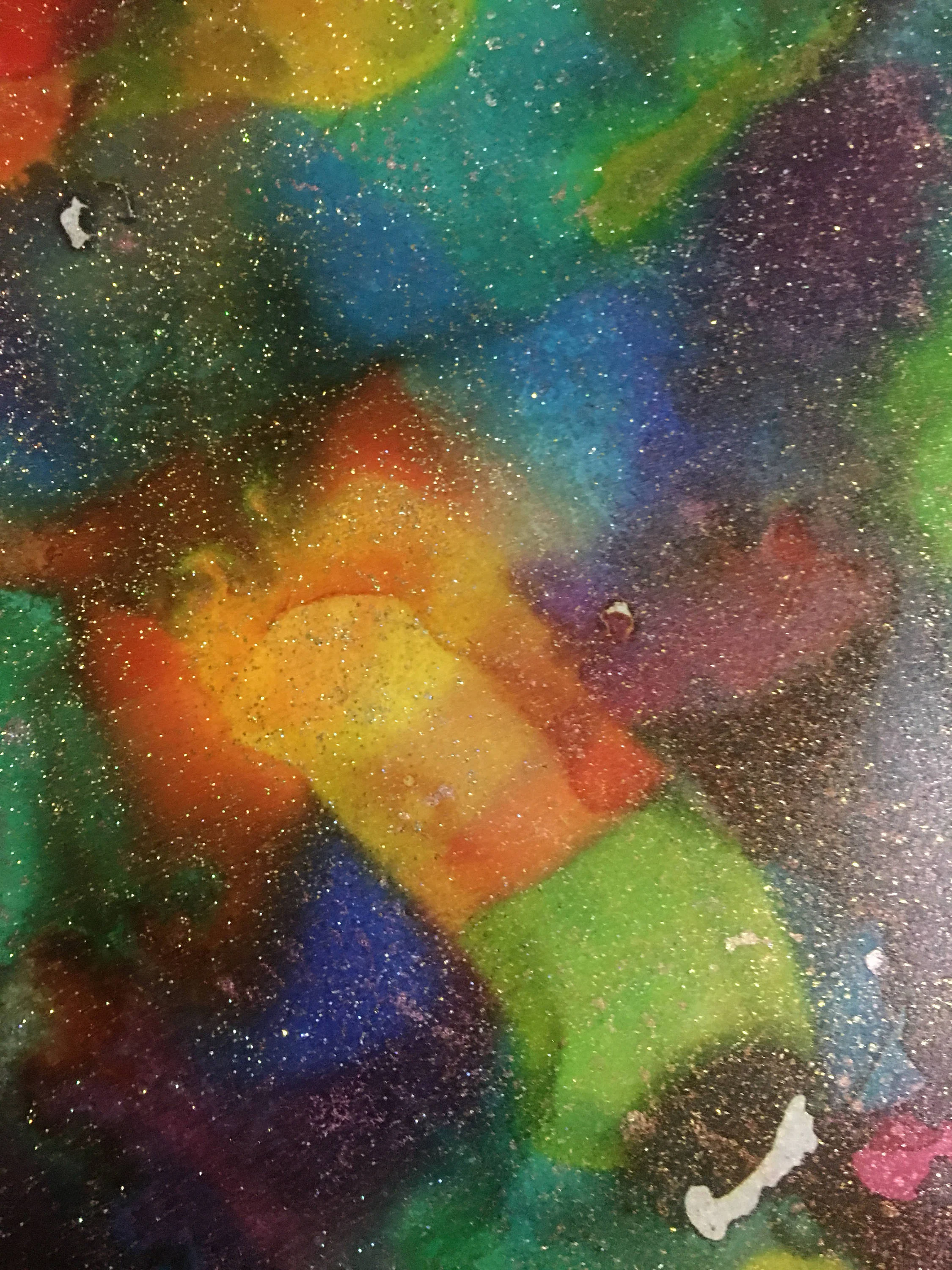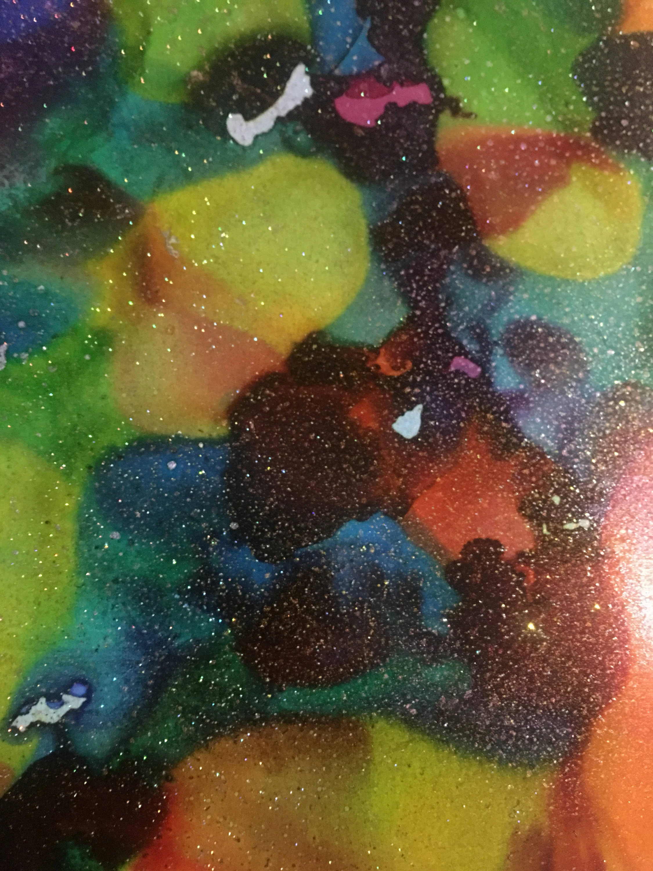 Primary colors are in the forefront of this painting featuring a multi layered textured coating. With silver pigment, gold Halo Glitter and water, this painting had a metallic shimmering edge with a waterlogged top layer. Seeming to radiate out of the frame, this one of a kind mixed media painting is not available currently as a print and can not be reproduced.