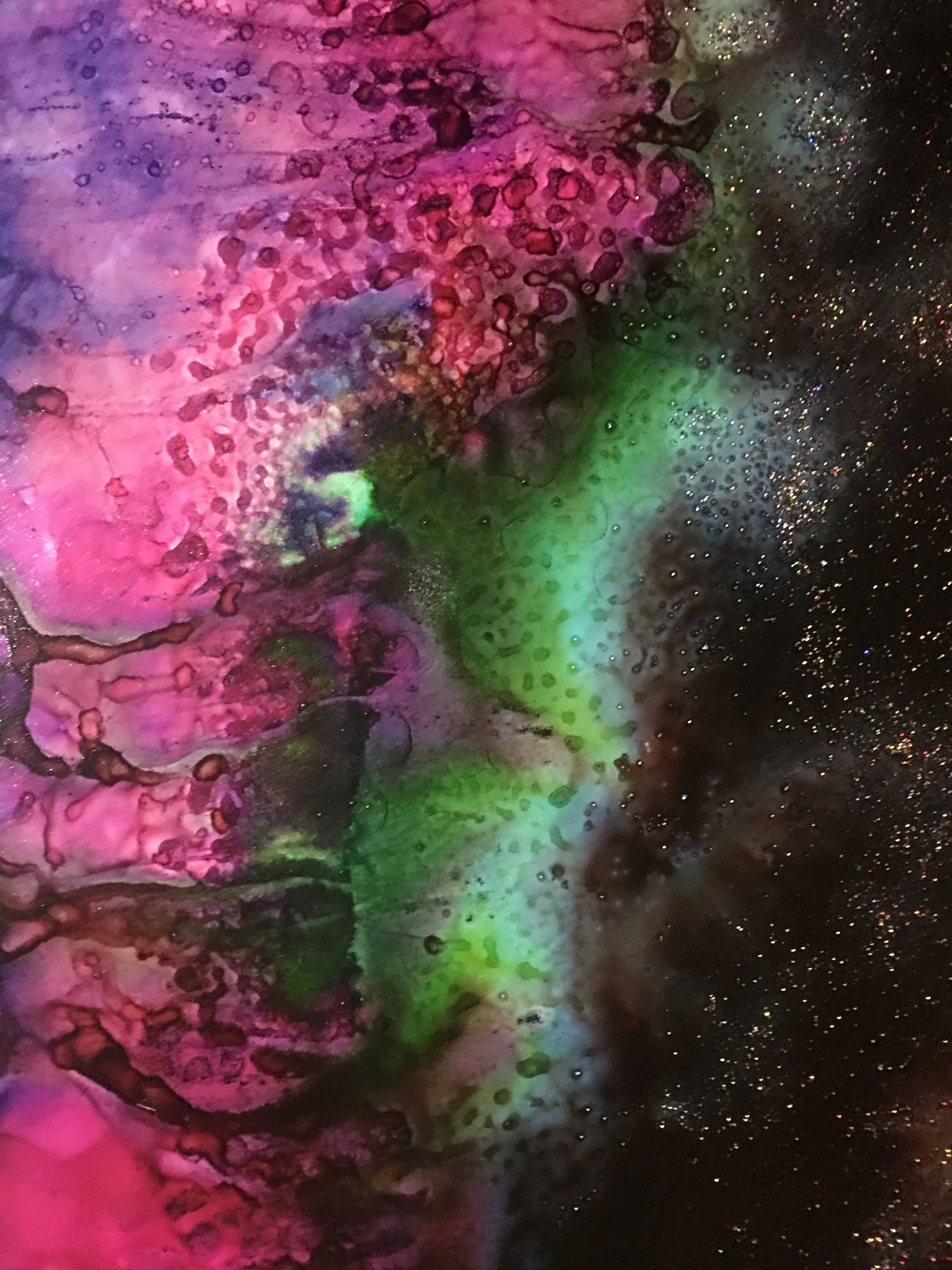 Skin of texture and bright colors with the hint of sparkle and shimmer. Perhaps the skin of an exotic iguana or chameleon, this lively and energetic painting is fused in vibrant greens, high energy fuchsias, purple and centered by deep black. This one of a kind, Alcohol Ink painting is not available currently as a print and can not be reproduced.